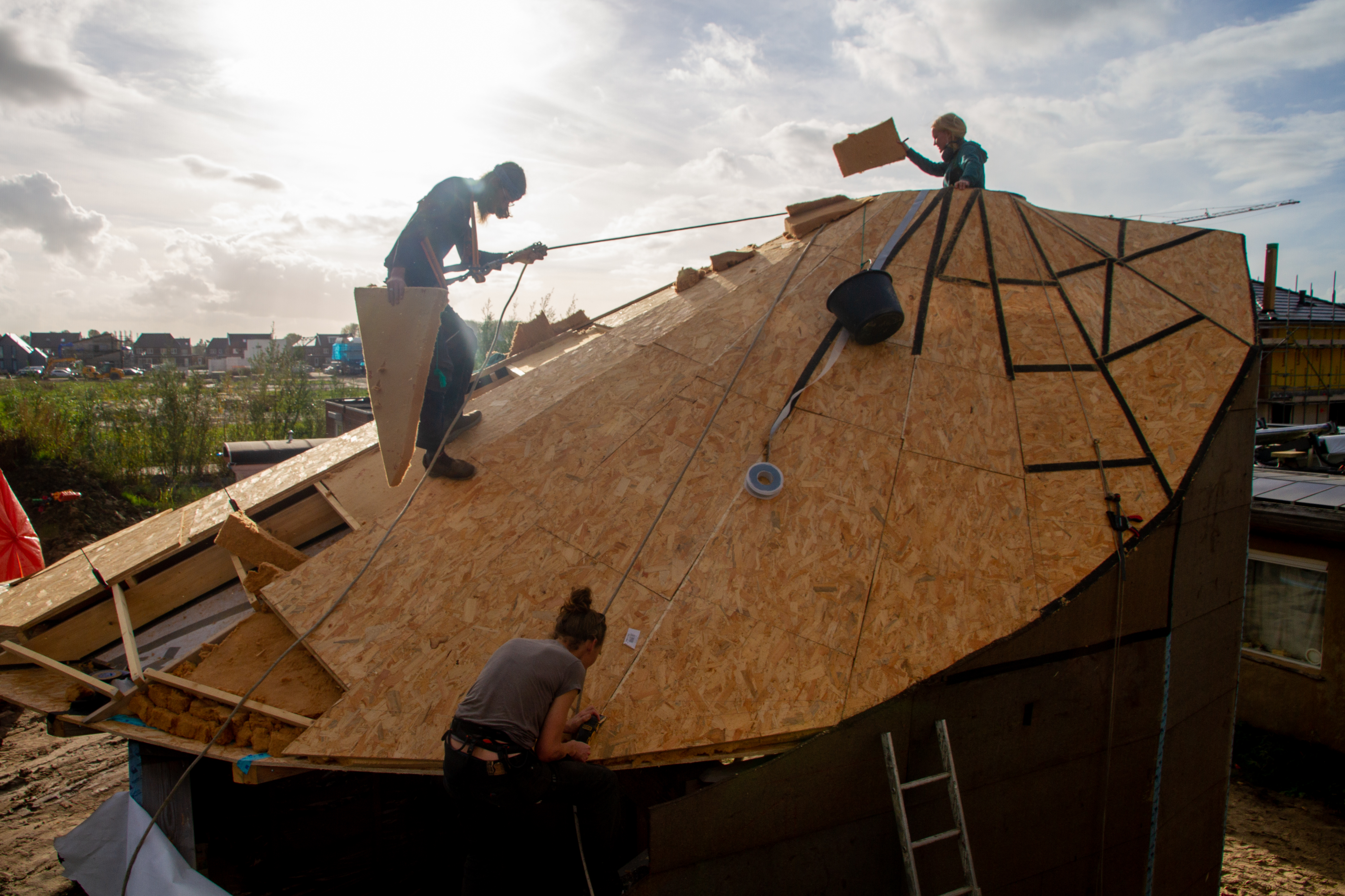 Ons huis bouwproject tot dusver heeft gevoeld als ‘standing in the arena’. Veel mensen vroegen zich ook af waar we aan begonnen waren. We deden iets wat we nog nooit hadden gedaan en waarbij ons gezicht en handen letterlijk werden bedekt met stof, zweet en bloed. We kenden grote enthousiasmes wanneer de eerste paal de grond in ging. Toen we samen met anderen de boom in het midden van ons huis rechtop hebben gezet. Toen we dapper door streden om het dak als puzzel (bijna) dicht te krijgen. We hebben gehuild en gelachen en stonden op wanneer we vielen. Fouten waren te zien. Boortjes die in het hout afbraken, de vliesgevel die geen onderdorpel had of de douche afvoer die in de binnenmuur uitkwam. De grootste fout was de bouw verzekering die we vergeten waren te verlengen, en misschien ook wel de lithium ion accu die we die nacht aan de lader hebben gelegd.